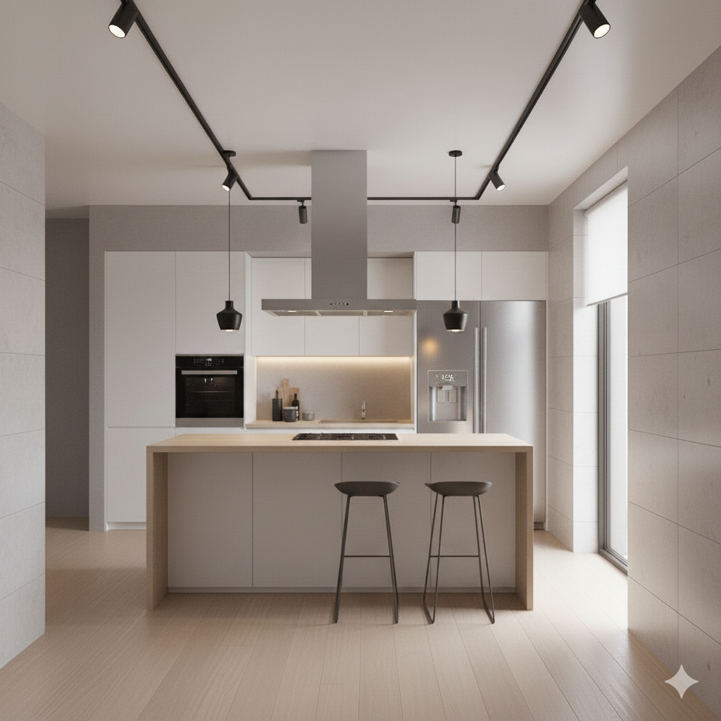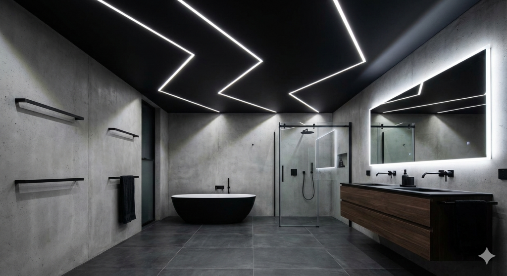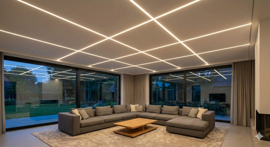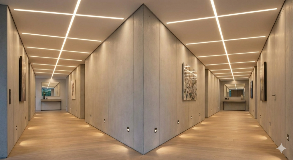Diese filigranen Lichtakzente betonen die Struktur des Raumes auf subtile Weise und verleihen dem gesamten Design eine moderne, dynamische Ästhetik.