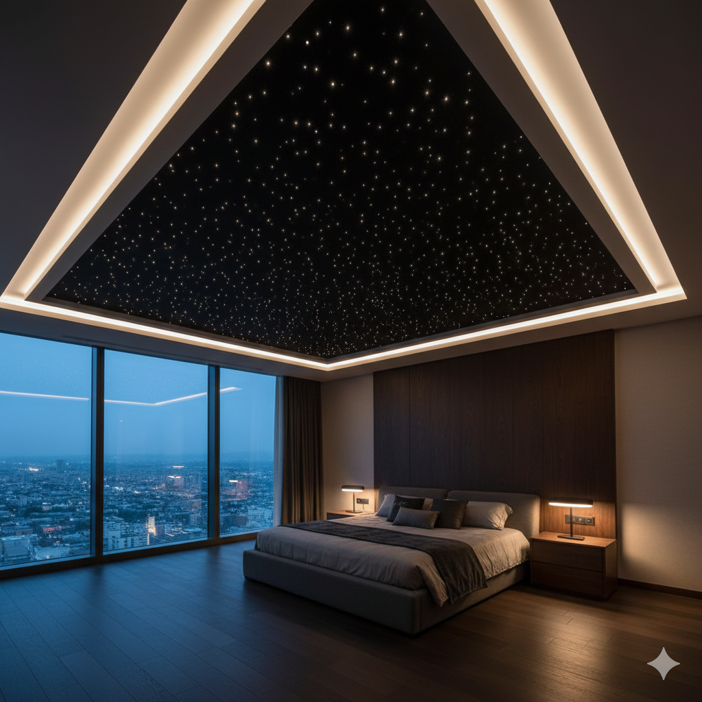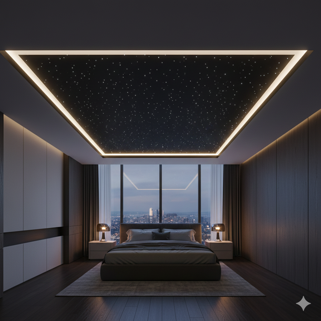 Diese Technik bietet grenzenlose Gestaltungsfreiheit: Sie lässt sich effektvoll mit einem Galaxie-Fotodruck für maximale Tiefe kombinieren oder als dezentes Highlight in eine klassische Spanndecke integrieren.