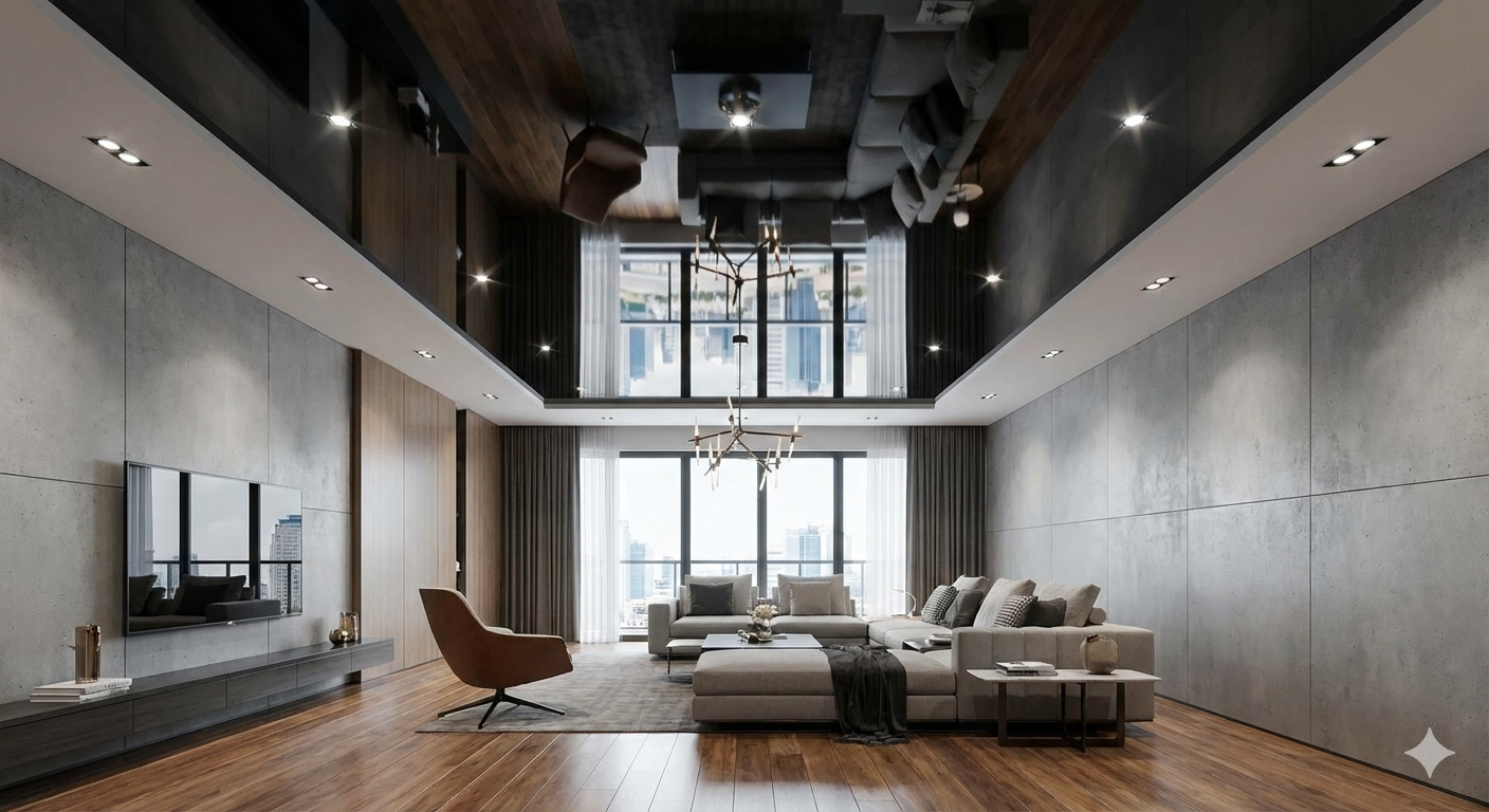 Verleihen Sie Ihren Räumen eine völlig neue Dimension. Hochglänzende Spanndecken fungieren als stilvoller Spiegel, der Ihrem Raum optisch mehr Tiefe und Höhe schenkt – für ein Gefühl von grenzenloser Weite.