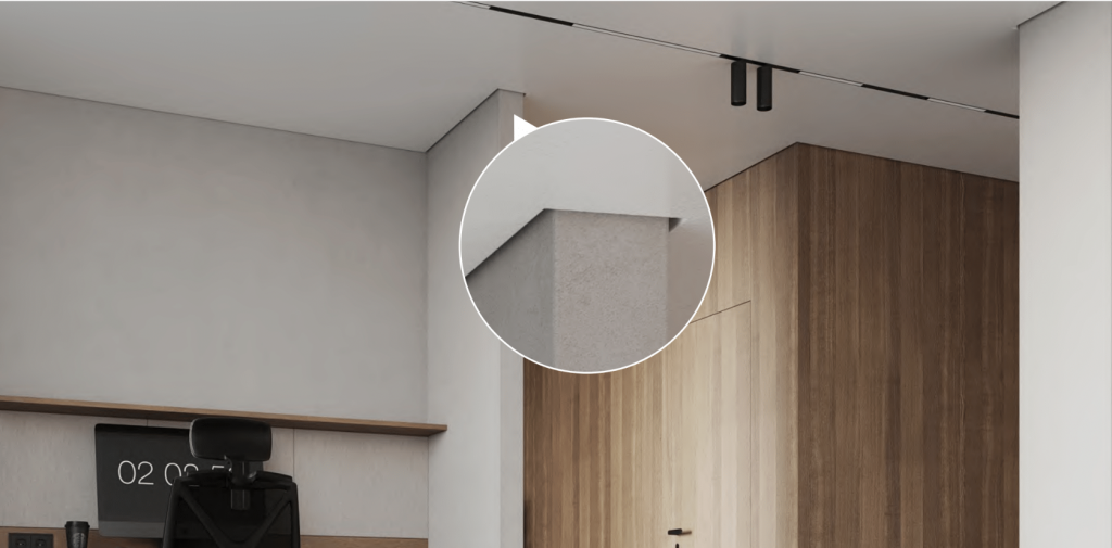 Profile mit Schatteneffekten erzeugen einen subtilen Abstand zwischen Decke und Wand, wodurch die Decke optisch zu schweben scheint. Diese Option eignet sich besonders für moderne und minimalistische Raumgestaltungen, da sie das Raumgefühl erweitert und dem Raum eine besondere Leichtigkeit verleiht.