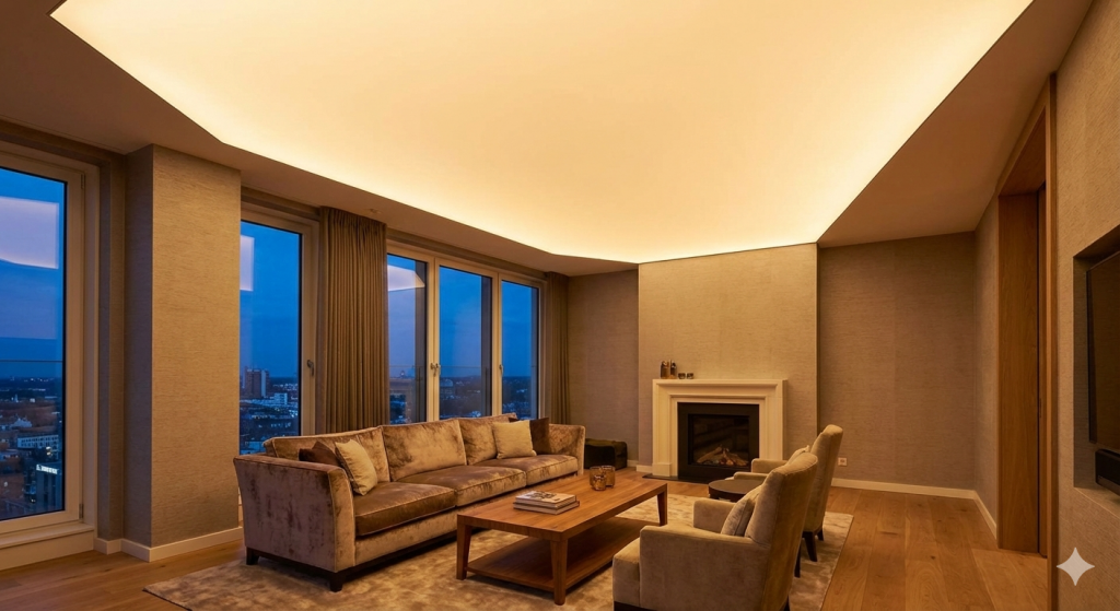 Beleuchtete Spanndecken sind eine moderne und elegante Lösung, um Räume gleichmäßig und angenehm auszuleuchten. Sie eignen sich besonders gut für Wohnräume, Büros, Empfangsbereiche oder Wellness-Bereiche, in denen ein sanftes, diffuses Licht gewünscht wird. Durch die Integration von LED-Beleuchtung hinter der Spanndecke entsteht ein indirektes Licht, das Schatten reduziert und eine warme, gemütliche Atmosphäre schafft.