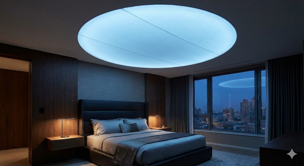 Die Double-Vision Spanndecke ist ein wahrer Verwandlungskünstler, der schlichte Eleganz mit beeindruckendem Design vereint. Das Geheimnis liegt in der rückseitigen Beleuchtung: Im ausgeschalteten Zustand präsentiert sich die Decke als klassisch matte, weiße Fläche, die Ruhe und Weite ausstrahlt.