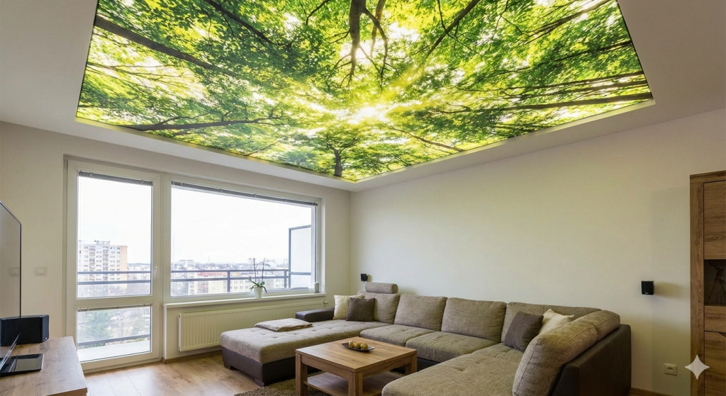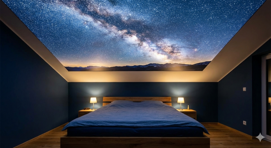 Beim Einsatz von Foto-Print Spanndecken ist zu beachten, dass die Bildqualität hochauflösend sein muss, um ein scharfes und detailreiches Druckbild zu gewährleisten. Außerdem sollte das Motiv gut auf die Deckenfläche abgestimmt sein, damit es harmonisch wirkt und nicht überladen erscheint. Die Spanndecke wird aus speziellem, lichtechtem Material gefertigt, das auch UV-beständig ist, sodass die Farben lange erhalten bleiben. Im Übrigen weist sie alle Vorzüge einer klassischen Spanndecke auf – sie ist genauso robust und einfach zu reinigen.